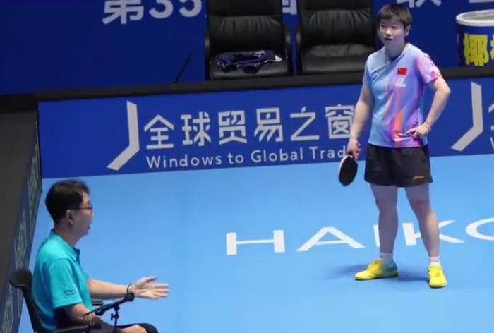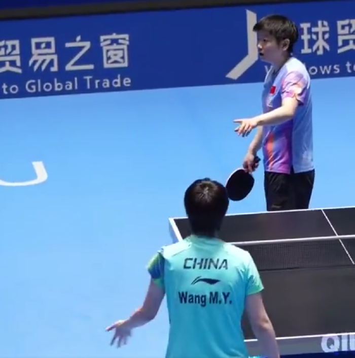 孙颖莎发现这一分已经给王曼昱加上后,孙颖莎向裁判申诉‘这球擦边了’,王曼昱好像没有看到这球,王曼昱有一个摊手的动作。