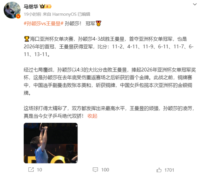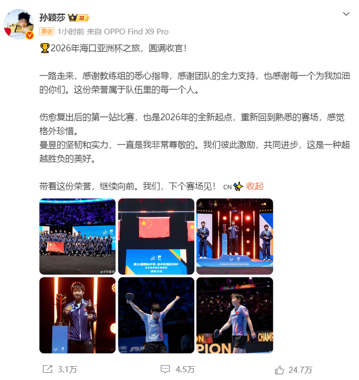 北京时间2月9日,亚洲杯金牌选手孙颖莎发布了长文,金牌2026年海口亚洲杯之旅,圆满收官。王曼昱的坚韧和实力一直是我非常尊敬的,我们彼此激励,共同进步,这是一种超越胜负的美好。