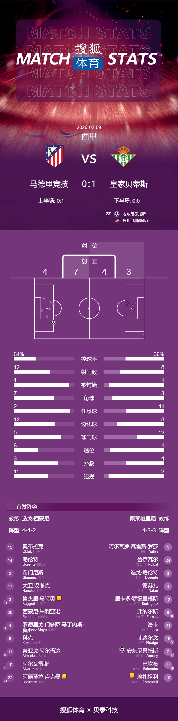 全场比赛结束,马德里竞技0-1皇家贝蒂斯。