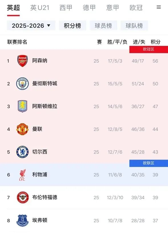 利物浦落后蓝军4分,暂时位于欧联区内,凭借净胜球优势领先布伦特福德。