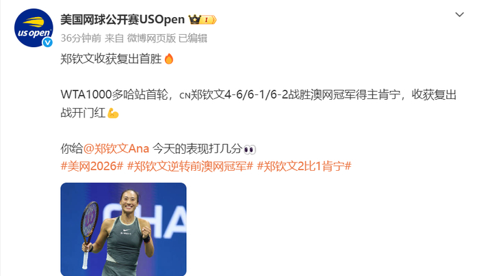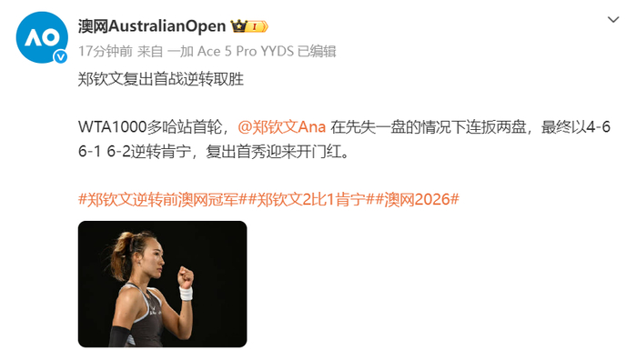 澳网写道:WTA1000多哈站首轮,郑钦文在先失一盘的情况下连扳两盘,最终以4-6 6-1 6-2逆转肯宁,复出首秀迎来开门红。