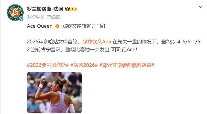 法网写道:2026年多哈站女单首轮,@郑钦文Ana 在先失一盘的情况下,最终以 4-6/6-1/6-2 逆转肯宁晋级,整场比赛她一共发出20记Ace!