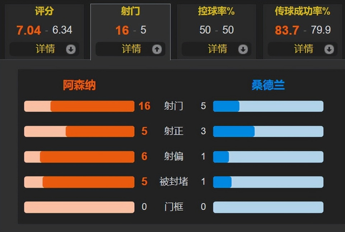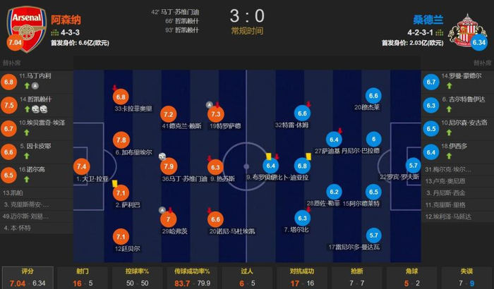 全场比赛,控球率五五开,阿森纳一共有16次射门,其中5次射正;桑德兰仅有5次射门,其中3次射正。其中约克雷斯2次射门2次射正打入2球,阿森纳需要利用和进一步开发瑞典中锋的身体和得分能力。