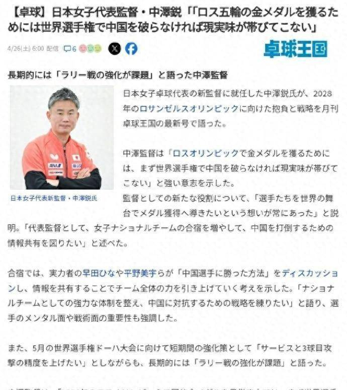 除了培养出来的那些选手,中泽锐对中国乒乓球队的打法可太熟悉了。这次他不但放话要打败中国队,还说出了自己的计划。
