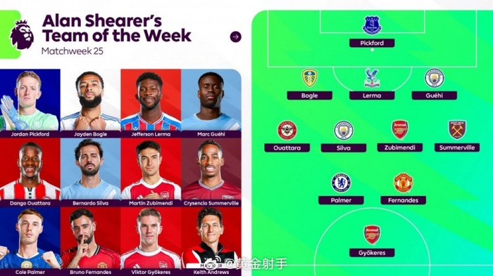 #曼城[超话]# 英超第25轮已经战罢,阿兰·希勒也评出了自己心目中的第25轮联赛最佳阵容。