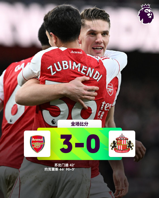 英超第25轮焦点战,阿森纳凭借苏比门迪的世界波和替补奇兵哲凯赖什的梅开二度,主场3-0完胜桑德兰,将积分榜领先优势扩大至9分,追平了03/04赛季的不败夺冠纪录。