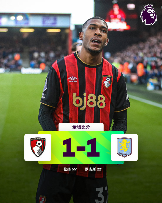 伯恩茅斯扳平:第55分钟,冬窗新援拉扬(19岁巴西边锋)内切抽射打入英超生涯首球,将比分锁定为1-1。这位身价近3000万欧的新援连续两场贡献关键表现(首秀助攻,次战进球),展现细腻盘带与冲击力。
