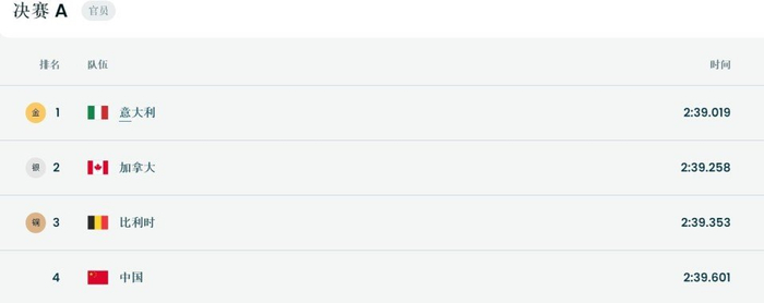 意大利队以2分39秒019的成绩获得金牌,加拿大队2分39秒258获得了银牌,比利时队2分39秒353获得了铜牌,中国队2分39秒601排名第4位,遗憾无缘领奖台。