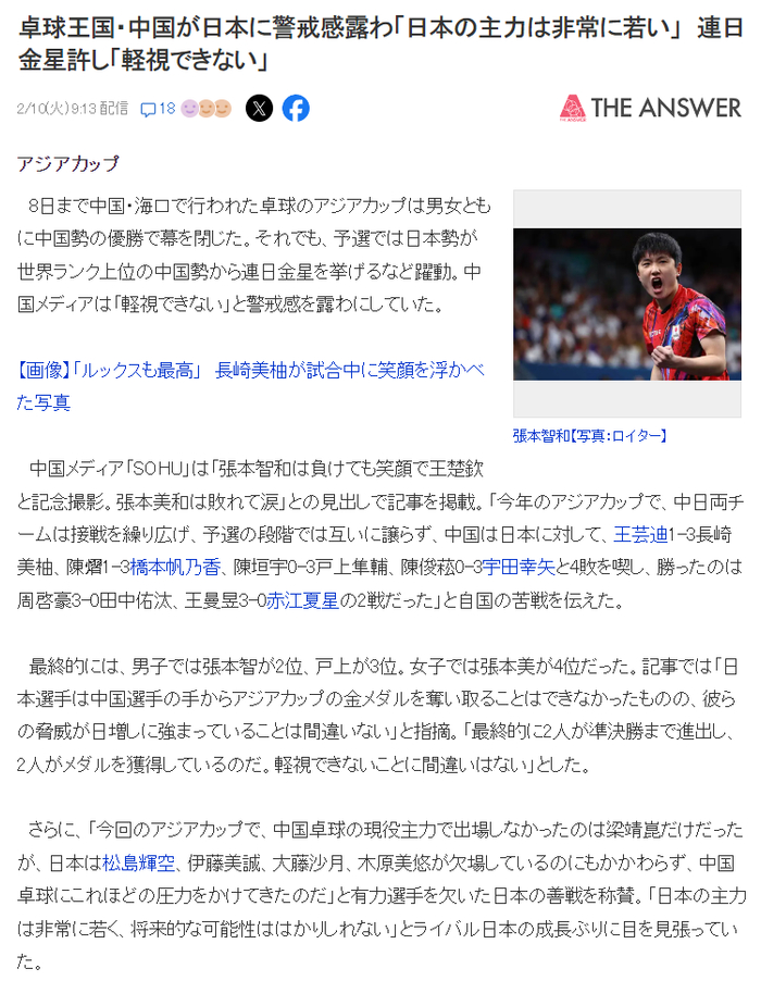 北京时间2月10日,日本媒体《The Answer》写道:乒乓球王国-中国队对日乒的主力们非常警惕,日本队的主力们都很年轻不容轻视。