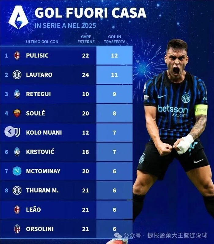 雷速:2025年意甲球员客场进球排行:普利西奇12球第一,劳塔罗11球第二