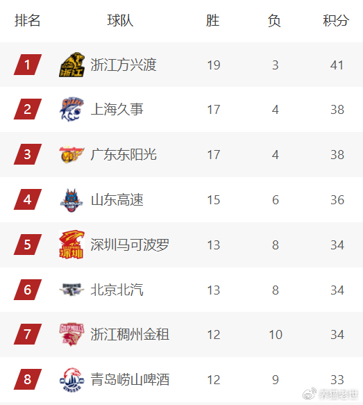 排在第四名的是山东队,这一轮比赛他们在主场以3分的微弱优势险胜广州队,战绩变成15胜6负,在少赛一轮的情况下,他们还是杀进积分榜第四名,是仅次于广厦、上海以及广东三队之后,CBA最有望冲击四强的球队。而排在第5名的则是深圳队,战绩为13胜8负。积分榜第6的是北京队,他们的战绩与深圳队一样,也是13胜8负。作为本赛季第一争冠热门球队,北京队目前的战绩确实让人倍感失望。