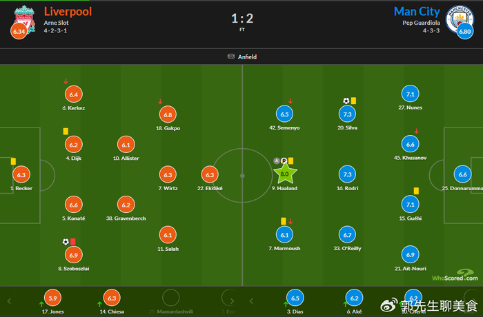 本场比赛索博斯洛伊世界波破门,帮助利物浦在主场率先取得进球,随后哈兰德先助攻贝尔纳多席尔瓦扳平比分,伤停补时阶段,自己又打入点球绝杀,帮助曼城2-1赛季双杀利物浦。