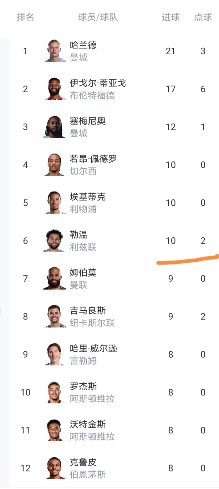 射手榜上佩德罗等6人进球上双。