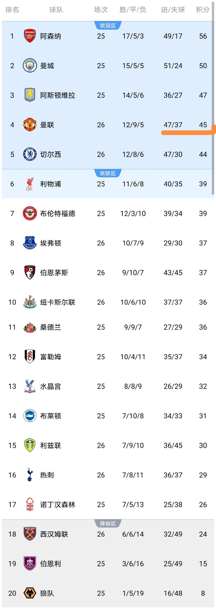 可以看到曼联遭阻击之后,积分仅上涨到45分,依然排名第4,没有追平维拉,很可惜啊,而切尔西遭阻击之后,积分仅上涨至44分,没有反超曼联,也是很可惜啊。今天凌晨曼联和切尔西都不够出色,都被实力不如自己的球队阻击,可见英超还是非常激烈的。热刺输球之后,积分停留在29分,热刺仅领先降级区5分,而纽卡赢球之后积分上涨到36分,仅落后第6的利物浦队3分,可以说纽卡逼近前六了。埃弗顿输球之后,积分停留在37分,无缘反超利物浦,这显然是天助利物浦,此外伯恩茅斯赢球之后,积分上涨到37分,已经逼近前六了。