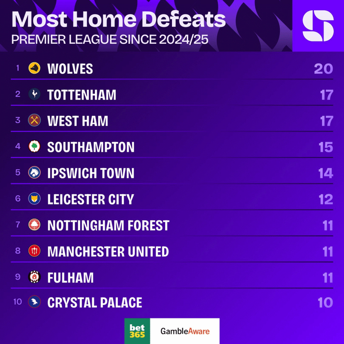 近2季英超主场输球榜:狼队居首,热刺西汉姆联并列第2