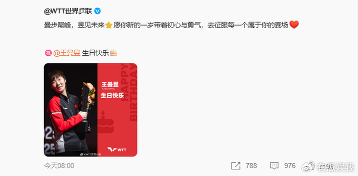 值得提醒的是,由于今天是王曼昱本人的生日,世界乒联也第一时间为王曼昱发声,他们写道:“曼步巅峰,昱见未来,愿你新的一岁带着初心与勇气,去征服每一个属于你的赛场!”