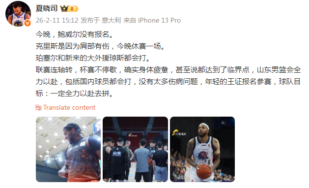 山东体育媒体人夏晓司透露,山东男篮外援鲍威尔和克里斯都无缘今晚的CBA俱乐部杯季军赛。