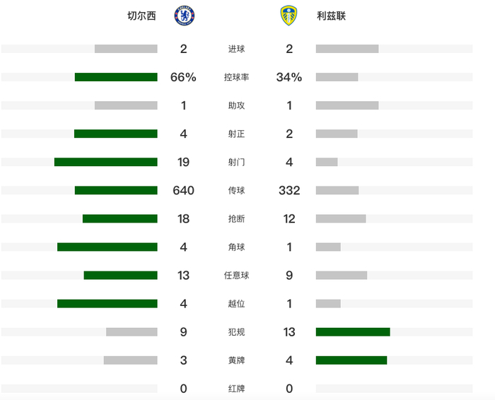 北京时间2月11日凌晨,英超一周双赛,第26轮总身价11.6亿欧元的切尔西主场迎战升班马利兹联。第24分钟,帕尔默助攻佩德罗单刀破门。第58分钟,帕尔默连续两轮打进佩德罗制造的点球,最近两场打进4球。第66分钟,凯塞多送点,恩梅查将球打进。第73分钟,奥卡福扳平比分。最终,切尔西在两球领先的情况下2-2战平利兹联,联赛4连胜就此止步。