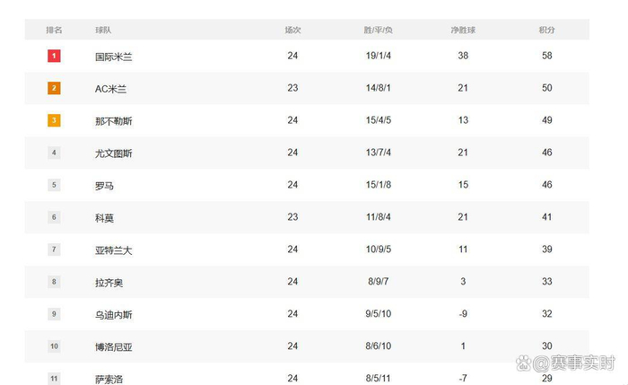 积分榜的顶端,国际米兰的领先地位愈发稳固。尽管本轮比赛的具体细节在提供的资料中未详细描述,但综合信息显示,国际米兰在24轮过后取得了19胜1平4负的战绩,积58分高居榜首。他们对阵中下游球队超高的拿分率,是建立巨大优势的关键。排名第二的AC米兰目前积50分,但他们少赛一场。即便如此,国际米兰依然握有8分的领先优势。排名第三的那不勒斯积49分,在争冠的道路上已经显得希望渺茫。