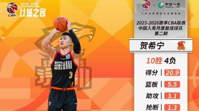 恭喜深圳队,CBA常规赛第二期的两名月最佳球员都给到了深圳队的球员,月最佳国内球员是贺希宁,月最佳外援是史密斯;月最佳防守球员是辽宁队的外援莫兰德。常规赛第一阶段的比赛结束,目前深圳队14胜9负排名第5,本赛季深圳队国内球员有贺希宁、王浩然,外援有史密斯,有机会再次打入季后赛四强。