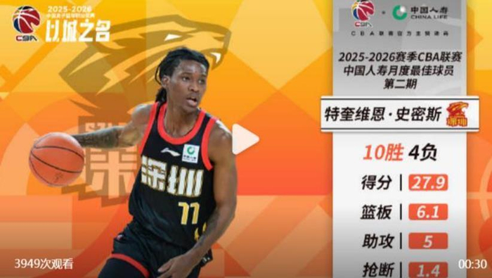 CBA第二期月最佳球员还是深圳队球员,外援特奎维恩-史密斯在第10-23轮比赛中场均出战27分钟,可以拿到27.9分6.1个篮板5.0次助攻和1.4次抢断,这期间他三分球命中率高达42.1%,场均可以命中3.6记三分球。本赛季至今23场比赛,史密斯有21场比赛得分上双,其中有7场得分30+,3场得分40+,单场最高得分45分。史密斯今年才23岁,深圳队这是又挖到宝了,如果他不主动要求离开大概率可以像萨林杰那样成为深圳队的重建基石。