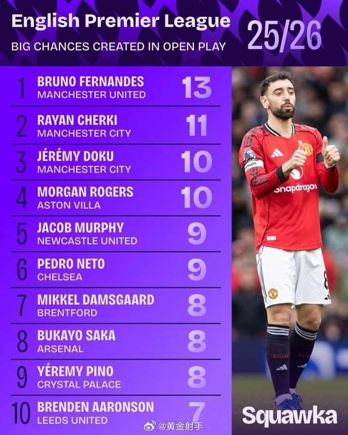 #曼城[超话]# squawka统计了本赛季英超球员在运动战创造重大机会情况,曼联队长B费依然领跑。