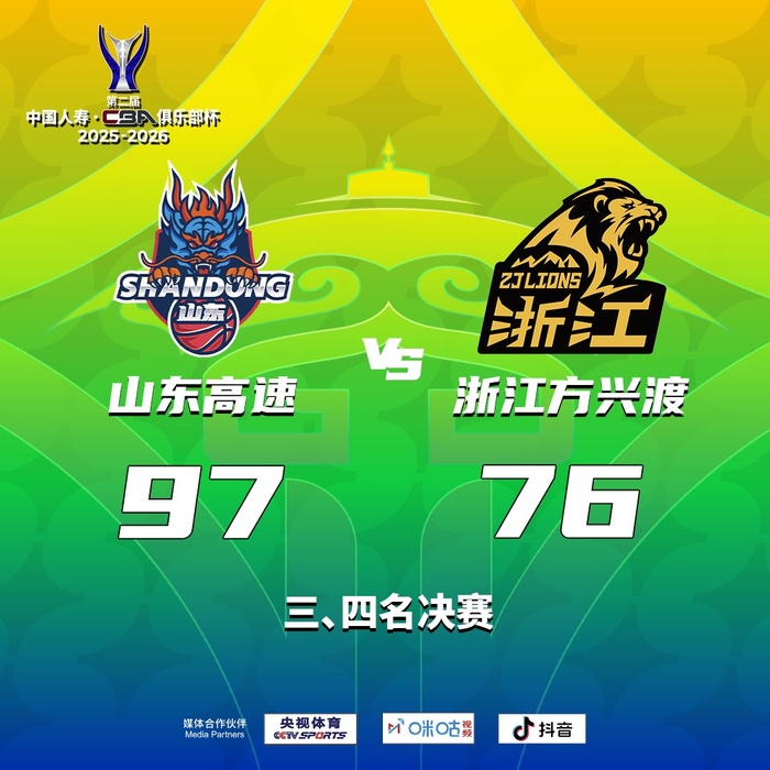 #CBA[超话]# 山东高速 97-76 浙江方兴渡 #山东男篮获CBA俱乐部杯季军#