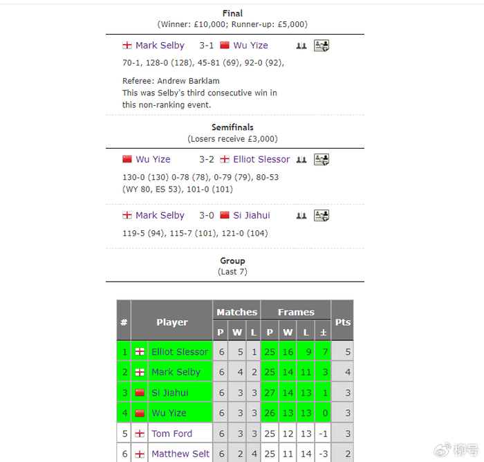 除了吴宜泽、张安达、斯佳辉3名中国选手之外,另外4位打进优胜组的小组冠军分别是:四届世锦赛冠军同时也是卫冕冠军的马克-塞尔比、“147分先生”汤姆-福德、前印度公开赛冠军马修-塞尔特以及埃利奥特-斯莱瑟。