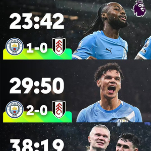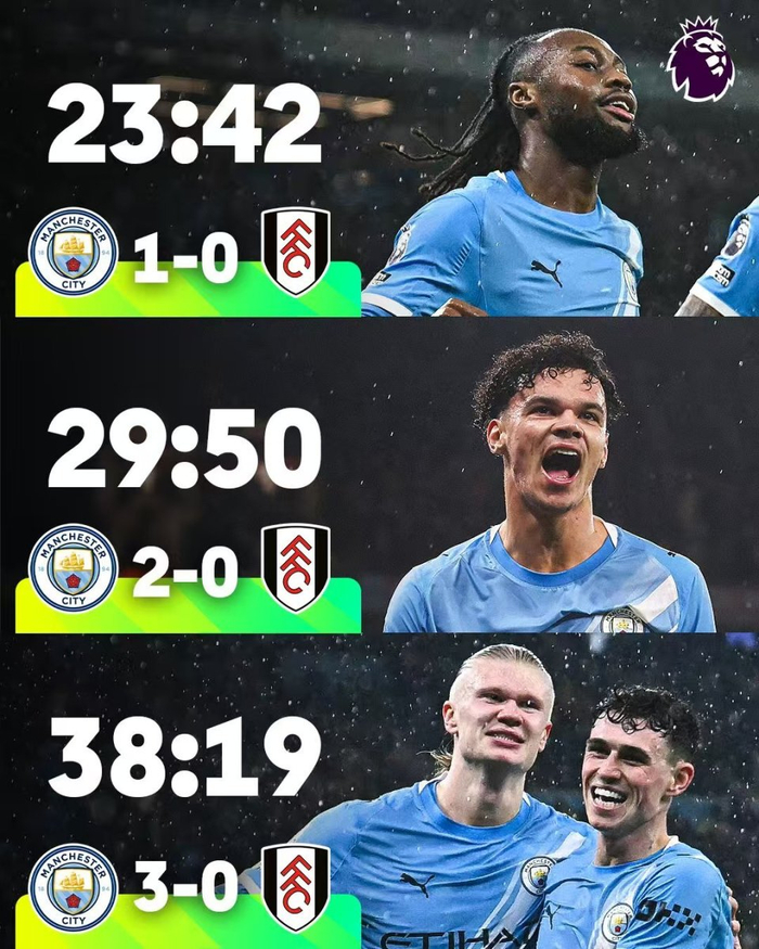 曼城半场3-0领先富勒姆,本赛季首次半场三球优势