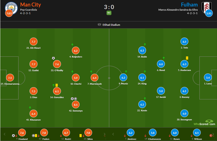本场比赛曼城在主场火力全开,塞梅尼奥、奥赖利和哈兰德在上半场就连入三球,下半场曼城开始控制节奏,虽然没有进一步扩大领先的优势,但也没有给对手缩小分差的机会,最终以3-0轻取富勒姆,完成了对后者的20连胜。