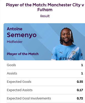 传射建功,塞梅尼奥当选曼城vs富勒姆球迷票选全场最佳