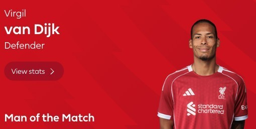 英超第26轮,利物浦客场1-0击败桑德兰,此役打入全场唯一进球的利物浦队长范戴克当选全场最佳球员。