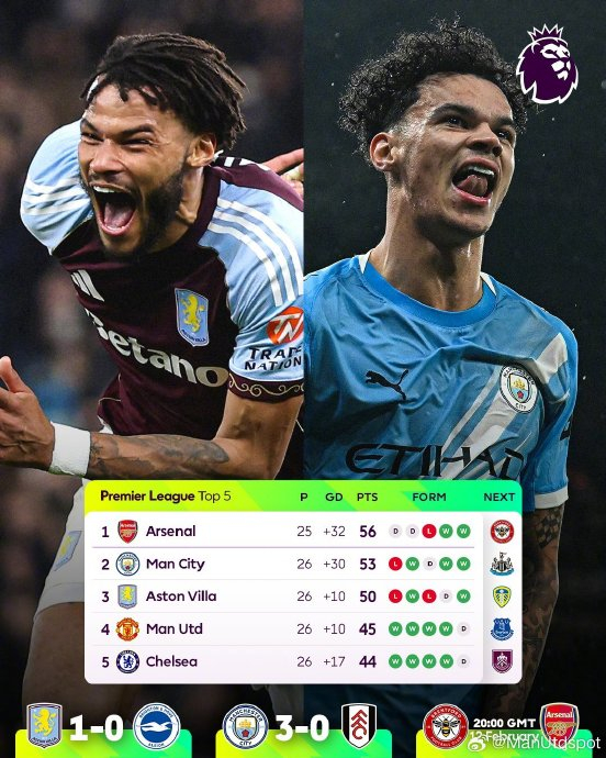 英超曼联遭维拉绝杀分差拉大,利物浦逼近欧冠区