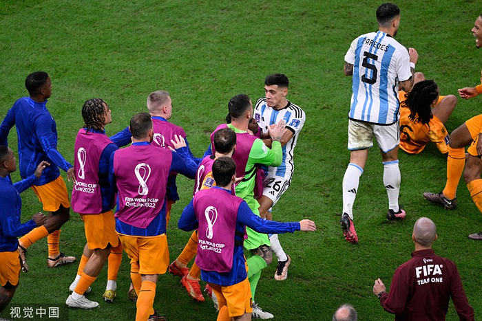 相比于赛后两队球员的隔空嘴炮,比赛中帕雷德斯怒射荷兰队替补席的那一球,则是双方最接近爆发肢体冲突的一次。