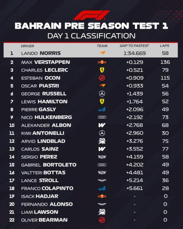 当地时间2月11日,F1季前测试在巴林国际赛道进行,兰多·诺里斯以最佳成绩领先,紧随其后的分别是马克斯·维斯塔潘和查尔斯·勒克莱尔。
