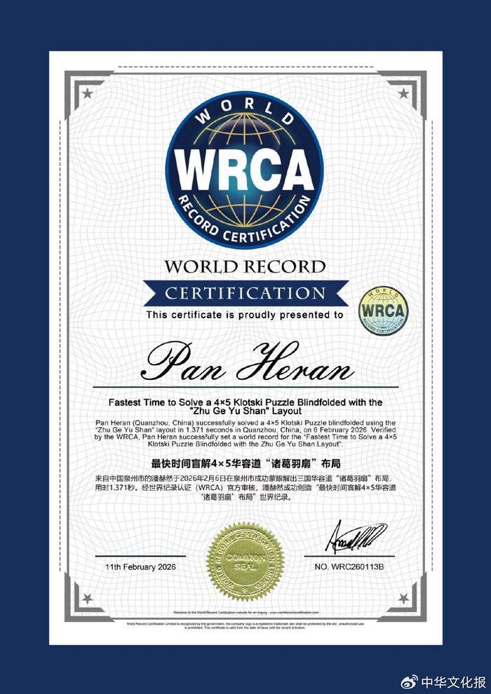 方寸棋盘间,指尖绽锋芒。2026年2月6日,福建泉州WRCA世界纪录官方认证现场传来捷报:7岁男孩潘赫然凭借极致的专注力与娴熟的技巧,使用魔域文化三国华容道,以1.37秒的惊人速度,成功打破最快时间盲解4×5华容道“诸葛羽扇”布局的WRCA世界纪录,用稚嫩指尖书写了中国少年的益智传奇,也让世界见证了中国青少年的奋进力量。