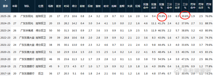35.8%的投篮命中率为生涯最低,比新秀时期的37.4%还低一个档次,而三分球投篮命中率为30.8%,则是生涯倒数第三,仅次于生涯前两个赛季。