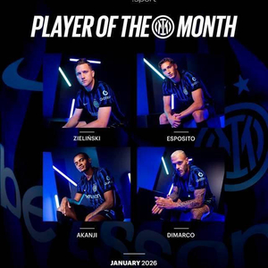 国际米兰官方公布了2026年1月份队内最佳球员的四名候选人,分别是泽林斯基、皮奥·埃斯波西托、阿坎吉和迪马尔科。入选者均展现了出色的状态和表现。最终获奖者将由球迷投票与俱乐部评审共同决定,增添了球迷参与感与互动乐趣。