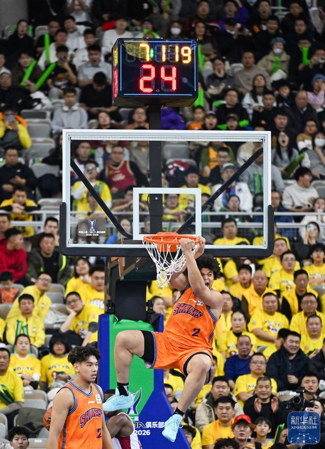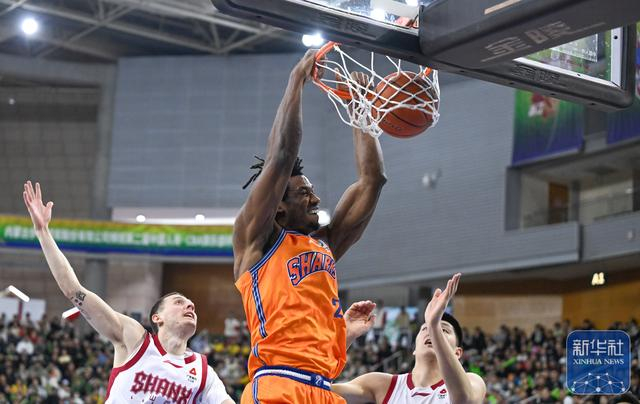 ↑ 上海久事队球员怀特塞德(中)在比赛中扣篮得分。