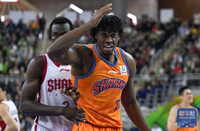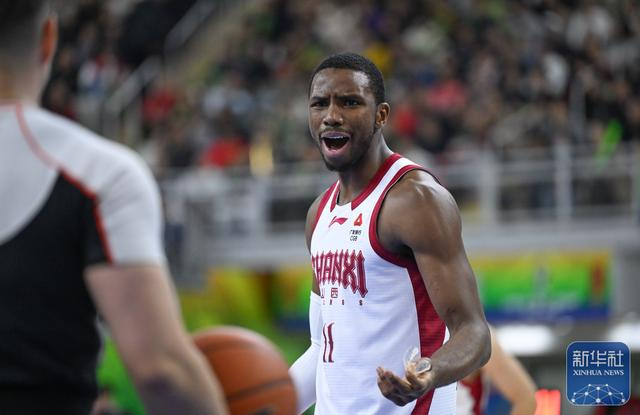 ↑ 山西汾酒队球员迪亚洛(右)在比赛中与裁判沟通。