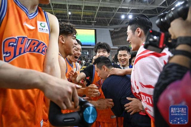↑ 上海久事队球员偰李永炜(前)在赛后庆祝夺冠。