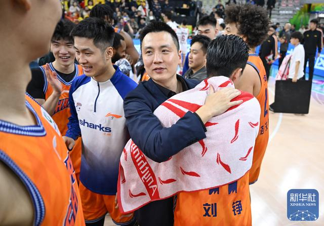↑ 上海久事队主教练卢伟(前右二)与球员刘铮(前右一)在赛后拥抱。