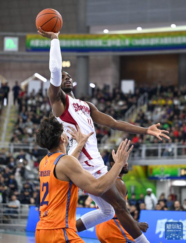↑ 山西汾酒队球员迪亚洛(上)在比赛中上篮。
