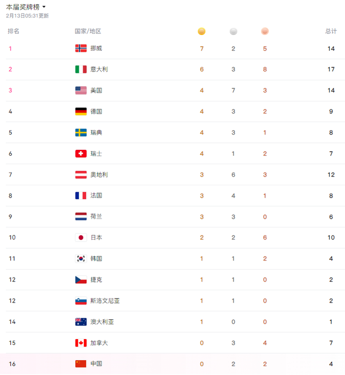 6人参赛,1人夺牌!冬奥会最新奖牌榜:中国排第16,落后日本韩国