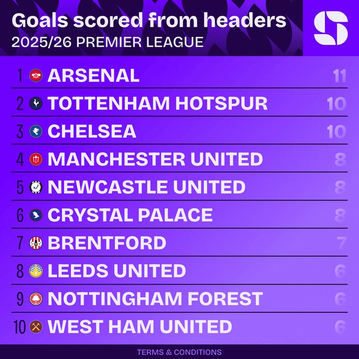 根据最新统计,阿森纳目前以11粒头球位居英超头球进球榜榜首。紧随其后的是热刺,以10粒头球进球排在第二位,并与切尔西并列。