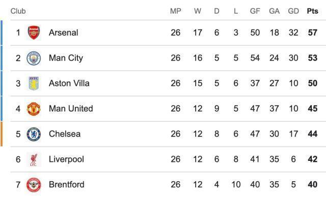 英超第26轮,阿森纳客场1比1被布伦特福德逼平,领先优势被缩减到4分。