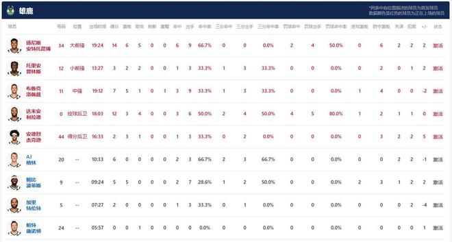 雄鹿方面字母哥投篮9中6,得到14分6板5助;利拉德投篮6中3,三分4中2,得到12分3板4助。