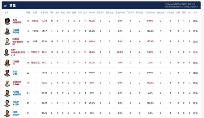 雷霆方面亚历山大投篮13中4,三分5中1,得到10分3板2助;哈滕投篮5中5,得到14分7板2助1断。