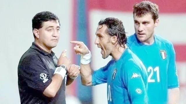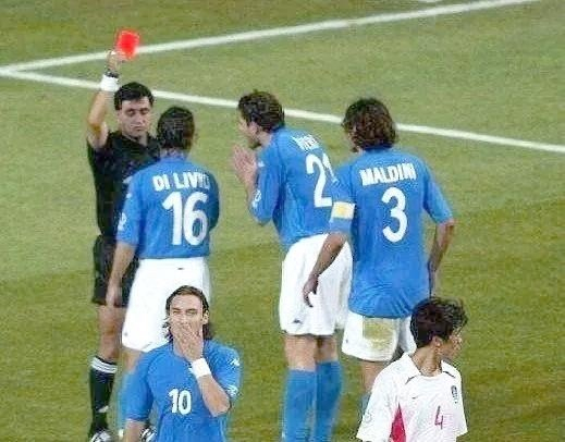 第111分钟,托马西反越位单刀破门,边裁举旗越位,进球无效。慢镜显示托马西明显不越位,属重大误判。直到第117分钟,安贞焕头球金球绝杀,意大利出局。而全场比赛,意大利6黄1红,韩国仅3黄,判罚尺度严重失衡。