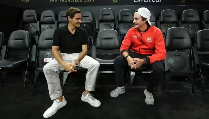 2025年拉沃尔杯,费德勒与丰塞卡会面,两人的神情动作确实比较相似